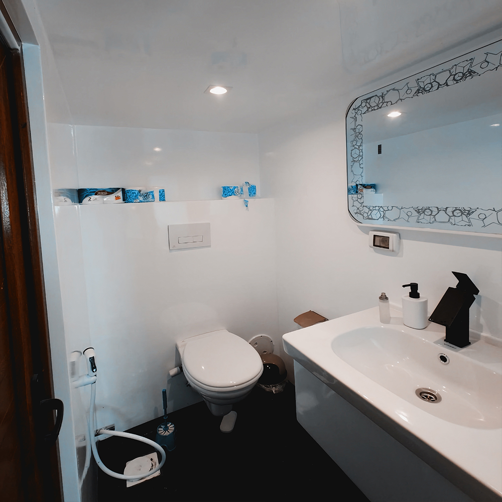 Visos kajutės turi privačius tualetus, dušą ir individualiai valdomus kondicionierius.